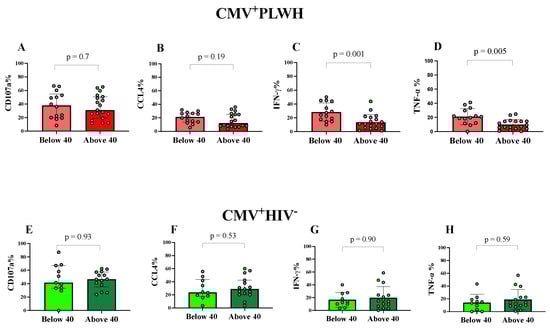 Figure 5 compares the frequency of adaptive NK cells expressing CD107a and secreting CCL4, IFN-γ and TNF-α in response to stimulation with HIVIG opsonized siCEM cells in participants aged <40 versus ≥40 yrs of age. There were no significant differences in the frequency of antibody opsonized target cell stimulation of adaptive NK cells expressing CD107a or secreting CCL4 from either CMV+PLWH or CMV mono-infected subjects who were <40 versus ≥40 yrs of age (Figure 5A,B,E,F). A significantly higher frequency of adaptive NK cells from younger than older CMV+PLWH secreted IFN-γ and TNF-α (p ≤ 0.005 for both, Mann—Whitney tests, Figure 5C,D). These differences remained statistically significant following the application of Bonferroni corrections. On the other hand, the frequency of adaptive NK cell producing each of the functions tested did not differ significantly in CMV mono-infected subjects (Figure 5G,H).