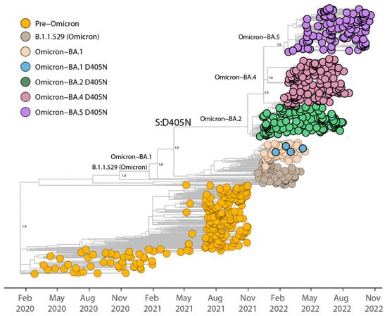 The genomic sequence dataset evaluated in the current study was based on 6,910,627 million full-length SARS-CoV-2 sequences, available in the Global initiative on sharing all influenza data (GISAID) until October 2022 [25,26]. Globally, the trend of surging D405N mutation across VOCs sequence was customly evaluated, excluding low-quality genomes. Phylogenetic analysis on SARS-CoV-2 genomic data was conducted using a set of representative data (n = 731) collected up to November 2022, belonging to different lineages (Pre-Omicron, B.1.1.529, Omicron BA.1, the few available strains belonging to the Omicron BA.1 lineage which showed the D405N mutation, Omicron BA.2, Omicron BA.4 and Omicron BA.5) [27]. All sequences were aligned using the ViralMSA tool [28,29], and IQ-TREE2 [30] was used for phylogenetic analysis following the maximum likelihood (ML) approach. TreeTime [31] was used to transform this ML tree topology into a dated tree using a constant mean rate of 8.0 × 10−4 nucleotide substitutions per site per year after the exclusion of outlier sequences.