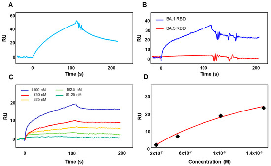 Recombinant RBD of SARS-CoV-2 Spike protein belonging to Omicron BA.5 does not bind to immobilized αvβ3 integrin. (A) The specificity of the integrin surface was demonstrated by the binding of the monoclonal antibody against αvβ3. (B) RBD of SARS-CoV-2 Spike protein belonging to Omicron BA.1 (blue line) or Omicron BA.5 (red line) sublineages at a concentration of 1500 nM was injected onto immobilized αvβ3 integrin. (C) Sensogram overlay showing the binding of increasing amounts of the RBD of SARS-CoV-2 Spike protein belonging to Omicron BA.1 (from 81.25 to 1.500 nM) sublineage to immobilized αvβ3 integrin. The response in resonance units (RU) was recorded as a function of time. (D) Saturation curve obtained by using the values of RU bound at equilibrium from the injection of increasing concentrations of free RBD onto sensorchip immobilized αvβ3 integrin.
