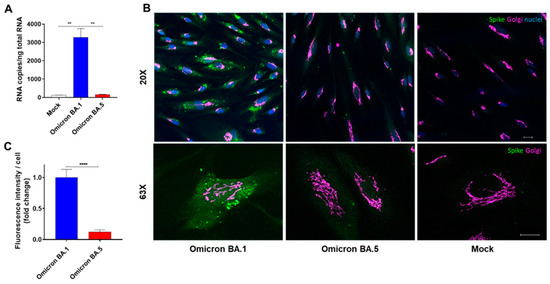 HL-mECs were seeded (5 × 104 cells per well) on collagen-coated 8-well chamber slides (Thermo Fisher Scientific) and infected with SARS-CoV-2, belonging to the Omicron BA.1 and BA.5 sublineages, as described above. Twenty-four h post-infection (p.i.), cells were fixed with 4% paraformaldehyde (PFA) in Phosphate-buffered saline (PBS) for 10 min, permeabilized with 0.1% Triton X-100 in PBS, and saturated with 3% Bovine serum albumin ((BSA) Merck KGaA, Darmstadt, Germany), 0.1% Tween 20 in PBS. For staining, cells were incubated for 1 h with a human serum containing IgG to SARS-CoV-2 (collected from volunteers who received the BNT162b2 vaccine, 1:1000 dilution) and anti-GM130 antibody as a cis-Golgi marker (Abcam, Cambridge, UK), followed by Alexa Fluor 488-conjugated anti-human IgG or Alexa Fluor 647-conjugated anti-rabbit IgG (Thermo Fisher Scientific). Nuclei were counterstained with 4′,6-diamidino,2-phenylindole ((DAPI), Merck KGaA). Mock cells were used as a negative control. Fluorescence was recorded using a Zeiss Axiovert 200 epifluorescence microscope equipped with a Plan-Neofluar 20×/0.5 NA and a Plan-Apochromat 63×/1.4 NA objectives and with an Apotome imaging system (Zeiss Axiovert 200M system). Image quantification was performed using Fiji image analysis software (NIH, Bethesda, USA). Briefly, the Spike-related fluorescent area was quantified in 20–30 Omicron BA.1 and Omicron BA.5 infected cells and subtracted from the non-infected cells’ fluorescence signal. The decrease of Spike-related fluorescence in Omicron BA.5 cells was related to the Omicron BA.1 signal.