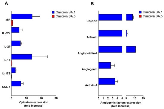 In order to understand whether SARS-CoV-2 Omicron BA.5 inability to enter into HL-mECs was impacting cell functions, we analyzed the infected-HL-mECs secretome at day 3 p.i., by using human angiogenic and cytokine arrays. As shown in Figure 4A, Omicron BA.1-infected HL-mECs (blue bars) released different pro-inflammatory molecules, among which one of the most expressed was IL-18. It is worth noting that activation of the IL18/IL18R1/HIF-1 signaling axis was found to mediate an increased risk of peripheral vascular diseases such as aneurysms and atherosclerosis after COVID-19 [37]. On the other hand, Omicron BA.5-infected HL-mECs (red bars) did not secrete any pro-inflammatory cytokines. At the same time, Omicron BA.1-infected HL-mECs promoted the secretion of different angiogenic factors (Figure 4B). On the contrary, Omicron BA.5-infected HL-mECs did not release angiogenetic factors (Figure 4B).
