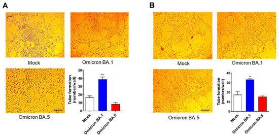 We previously showed that SARS-CoV-2 B.1- and B.1.617.2-infected HL-mECs displayed a remodeled phenotype and potent angiogenic activity [20,21]. Due to the lack of infection, HL-mEC dysfunction is likely to be inhibited following cell contact with Omicron BA.5. To this aim, we explored the angiogenic function of HL-mECs following Omicron BA.5 infection. As shown in Figure 5A, HL-mECs infected with Omicron BA.1 developed a consistent network of tube-like structures at 12 h after cell seeding on 48-well plates (4.5 × 104 per well) coated with growth factor-reduced BME, attesting for a potent viral-induced angiogenic activity. At the same time, HL-mECs infected with Omicron BA.5, similarly to mock-infected cells, formed a cellular monolayer on the extracellular matrix, attesting to a lack of angiogenic activity.