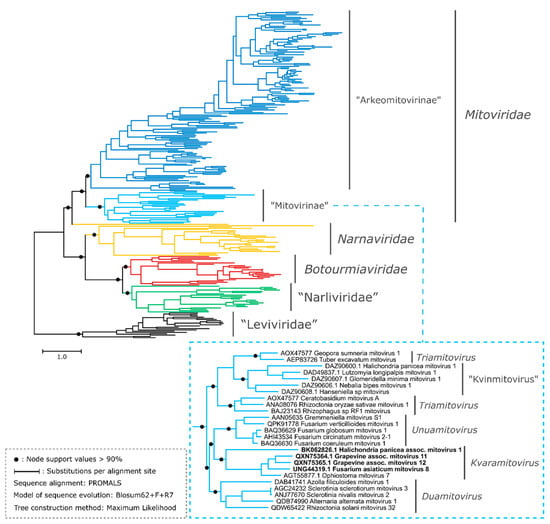 3.2. New Putative Mitoviruses in the Phylogenetic Context of the Phylum Lenarviricota