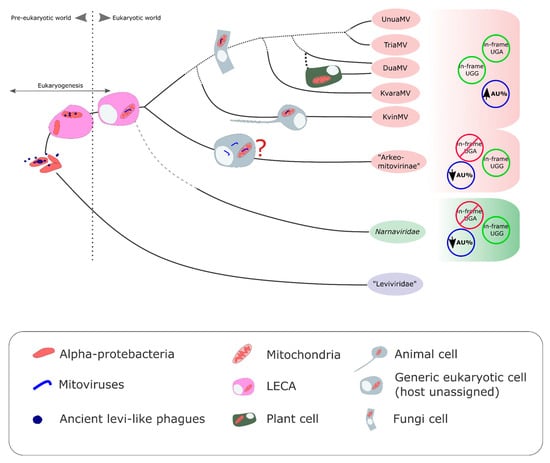 - Nibert, M.L. Mitovirus UGA(Trp) codon usage parallels that of host mitochondria. Virology 2017, 507, 96–100. [Google Scholar] [CrossRef] [PubMed]