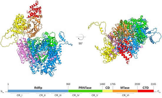 Structural model of the RSV L protein. The RSV L domains were structurally modeled and are shown as ribbons colored in: blue, RNA-dependent RNA-polymerase (RdRp) domain; green, polyribonucleotidyl-transferase (PRNTase) domain; yellow, connector domain (CD); orange, methyltransferase (MTase) domain; red, C-terminal domain (CTD); purple, tetrameric phosphoprotein aligned from the RSV polymerase complex structure (PDB: 6PZK). The linear scheme shows the RSV L protein domain organization with amino acid residue numbers indicating the functional domain boundaries. The conserved regions (CR) within the L proteins of NNS RNA viruses are indicated. RSV L structure was predicted by AlphaFold2 and interpreted with AlphaPickle [63,64]. Figures were prepared with CHIMERAX [65,66].