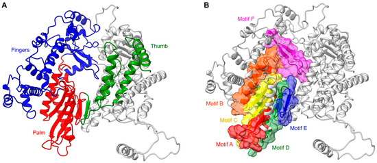 RSV RdRp features. (A) RdRp subdomain organization shown in ribbons with the palm in red, the fingers in blue, the thumb in green, and the remaining supporting structure in light gray. (B) Same position as in (A) with sequence motifs (A–F) of the active site shown in colored ribbons and highlighted surfaces.