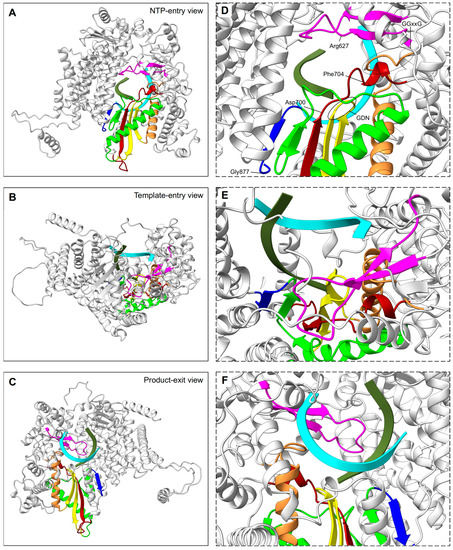 RSV RdRp channels of RNA synthesis stages. Left panels (A–C) display the RdRp domain as ribbons, viewed from the back, top, and bottom, respectively, to indicate: (A), NTP entry; (B), template entry, and (C), double RNA strand exit channels. Reference RdRp position and color coding of sequence motifs of the active site are the same as in Figure 2B. Right panels (D–F) are framed with a dashed line to indicate a close up of the active site from the respective left view. Aligned primer (olive) and template (cyan) molecules from the HCV polymerase structure (PDB: 4WTA) are shown in ribbons [94]. In (D), select residues relevant for catalysis are indicated, and conserved sequences are highlighted, including GDN (full line oval) and GGxxG (dotted line oval).