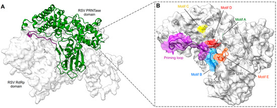 RSV PRNTase features. (A) The PRNTase domain is shown in green ribbons and the RdRp domain in light gray surface. The structural model of the priming loop, in dark violet, shows its position flipped up, away from the central cavity (indicated with the window) formed between the RdRp and the PRNTase. (B) Magnified view of the PRNTase domain with the same position as in (A) but shown as light gray ribbons with a transparent surface and conserved sequence motifs shown as sticks and highlighted in unique colors. The priming loop is in dark violet. Selected residues may help to form the PRNTase active site, thus anchoring motif B and D.