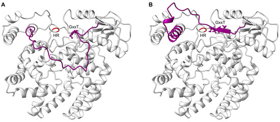 Snapshots of the PRNTase priming loop in initiation and elongation-compatible positions. The PRNTase domain is shown as light gray ribbons with the catalytic HR residues colored in red. The priming loop is shown in dark violet with the GxxT motif highlighted as spheres. The panels show snapshots of the priming loop in two different conformations—(A), down and (B), up—with respect to the RdRp domain as defined by the box in Figure 5A. This conformational change is presented in Video S1 evidencing the rearrangement undergone by the PRNTase domain. The priming loop in the down position is associated with an initiation compatible mode of the L protein for RNA synthesis. In this state, the priming loop is in the central cavity formed between the RdRp and the PRNTase domains, and it is close to the active site of the polymerase. The down conformation was modeled by alignment of the priming loop from the VSV polymerase complex structure (PDB: 5A22) to the AlphaFold RSV L model. The priming loop in the up position, as obtained from the AlphaFold RSV L model, is associated with an elongation compatible mode of the L protein and is accommodated close to the PRNTase active site, as is depicted in Figure 5A.