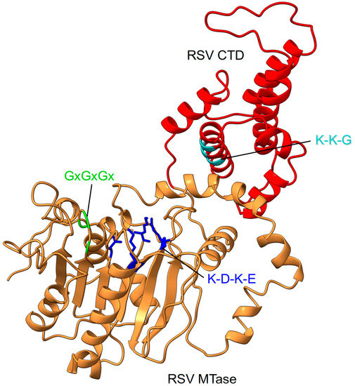 Although the structure of the RSV MTase and CTD is not yet experimentally characterized, a model can be generated that derives from the crystal structures of hMPV and the Sudan Ebola virus (SUDV) MTases that have been previously reported and provide some insights into the organization of these domains [136,137] (Figure 7).