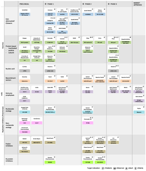 Currently, there is no vaccine or effective antiviral therapy against RSV, and the only pharmaceutical intervention since 1998 has been passive prophylaxis with a RSV fusion protein inhibitor monoclonal antibody (mAb) (i.e., Palivizumab). However, its use is limited to high-risk infants because of the elevated cost and moderate efficacy [14,15]. Recently, Nirsevimab, a long-acting monoclonal antibody for the prevention of RSV infections in newborns and infants, was approved by several regulatory agencies around the world [16,17,18]. RSV vaccine development has proceeded cautiously, particularly in RSV-naïve infants, due to the results of a series of clinical trials in 1966 in the US with a formalin-inactivated vaccine against RSV (FI-RSV). Aberrant immune responses to natural infection after immunization resulted in vaccine-enhanced respiratory disease (ERD), also known as antibody-dependent enhanced disease in infants [19,20]. The current vaccine development relies on the two RSV major antigens, the F and G proteins, that protrude from the surface of the viral membrane and are the only two proteins targeted by neutralizing antibodies [21,22,23]. More than 30 different vaccine candidates are in preclinical or clinical development, as well as mAbs [12]. In addition, there is a growing interest in developing small molecule inhibitors targeting the fusion process or antiviral compounds against the replication/transcription machinery.