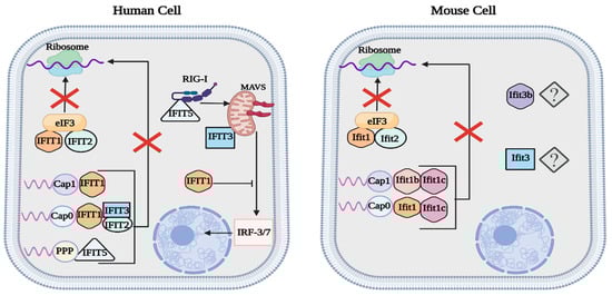 Summary of human and mouse IFIT function. Both human IFIT1/2 and mouse Ifit1/2 reduce viral protein translation by binding to eIF3, thus inhibiting the preinitiation complex. Similar to human IFIT3, mouse Ifit1c enhances the function of other IFIT proteins. IFIT1 is responsible for targeting cap 0/1 RNA in human cells, while mouse cells utilize Ifit1 and Ifit1b to target cap 0 and cap 1 RNA, respectively. IFIT5 binds to phosphorylated RNA and promotes the activity of MAVS. In contrast to IFIT3/5, IFIT1 acts as a negative regulator of the type-I IFN response. The function of mouse Ifit3 and Ifit3b has yet to be fully characterized. This figure was created with BioRender.com (accessed on 20 January 2023).