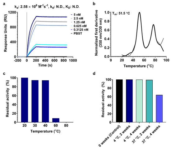 Encapsulin-mRBD in 1× PBS (pH 7.4) was subjected to transient thermal stress by incubating at various temperatures (20 °C, 30 °C, 40 °C, 60 °C, and 80 °C) in a thermocycler (Eppendorf, Hamburg, Germany) for 60 min. Following that, the protein was allowed to cool to RT, and binding to ACE2-hFc was monitored through SPR as described in the previous section. For binding studies after prolonged thermal stress, Encapsulin-mRBD in 1× PBS (pH 7.4) was incubated at 4 °C and 37 °C for 4 weeks. Binding to ACE2-hFc and CR3022 was recorded after 2 weeks and 4 weeks, using SPR, as described in the previous section.