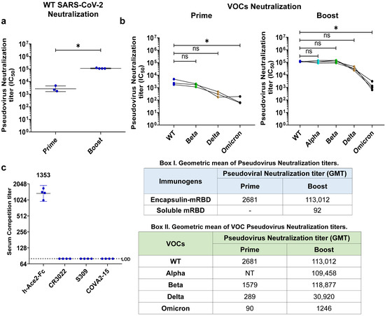 We next examined the neutralizing activity of encapsulin–mRBD nanoparticles immunized sera using a panel of SARS-CoV-2 spike pseudotyped viruses. After the prime immunization, encapsulin–mRBD induced appreciable titers of neutralizing antibodies that neutralized the wild-type (WT) and beta variant of concern (VOC) to similar extents (p-value: > 0.99) and the Delta VOC with slightly lower neutralization titers, although, the decrease was not significant (p-value: 0.12). Sera also showed neutralization of the divergent Omicron BA.1, although with significantly reduced titers compared to WT (p-value: 0.01). Following the boost, neutralizing antibody titers increased significantly (p-value: 0.02). The reciprocal serum half-maximal inhibitory concentrations (IC50) for WT, beta, and delta were enhanced ~42, ~75, and ~107-fold, respectively. Post-boost sera neutralized the alpha and beta VOCs with IC50 comparable to the WT and the delta variant with ~3.65-fold lower IC50 (p-value: 0.23). Omicron neutralizing activity, although lower compared to WT, was also substantially boosted compared to prime (Figure 4a,b). When compared to previous immunizations with the monomeric RBD [40], encapsulin–mRBD nanoparticles induced neutralizing responses of increased breadth and magnitude.
