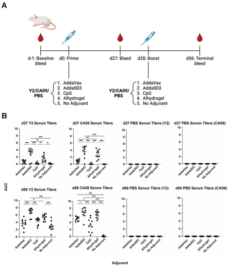 All procedures were reviewed and approved by the University of Georgia Institutional Animal Care and Use Committee (IACUC). For the H1 HA study, 10 six-to-eight-week-old male and female BALB/c mice (Charles River Laboratories, Wilmington, MA, USA) per group were immunized subcutaneously with 20 μg of Y2 COBRA HA, CA09 HA, or phosphate-buffered saline (PBS) adjuvanted with AddaVax, AddaS03, CpG ODN 2395, and Alhydrogel (Invivogen, San Diego, CA, USA), or with PBS as a no adjuvant control. Mice were bled at 27 days post-prime for d27 serum, then immunized at 28 days post-prime with 20 μg of the antigen. At 56 days post-prime, animals were bled for d56 serum, and then euthanized with Avertin.