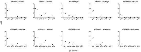 Th1/Th2 ELISAs at d56 after adjuvanted vaccination with Y2 and CA09 HAs. IgG subclass-specific serum titers, determined by ELISA, are shown for male and female pooled sera at d56 as AUC values. Coating antigens were the same HA as used for vaccination, The left point for each IgG subclass corresponds to male mice serum titers and the right point to female mouse serum titers. A minimum baseline absorbance at 405 nm of 0.3 was considered a positive binding signal.