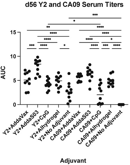 cH6/1 HA IgG titers at d56 after adjuvanted vaccination with Y2 and CA09 HAs. Serum IgG titers, determined by ELISA, are shown as AUC values for both Y2- and CA09 HA-immunized mouse groups. A minimum baseline absorbance at 405 nm of 0.3 was considered a positive binding signal. *, p ≤ 0.05; **, p ≤ 0.01; ***, p ≤ 0.001; ****, p ≤ 0.0001. One-way ANOVA was used for statistical comparisons between groups.