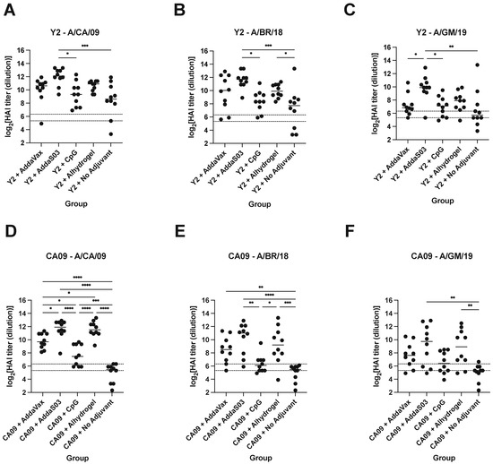 To determine whether the addition of adjuvant could alter the functionality of serum antibodies, we performed HAI assays against a panel of recent 2009 pandemic-like H1N1 viruses (Figure 5). We saw similar trends between HAI titers and ELISA serum IgG titers across adjuvants, where AddaS03 elicited the highest titers, followed by AddaVax and Alhydrogel, with CpG generally inducing the lowest titers of adjuvanted groups. All groups developed seroprotective titers (HAI titer >1:80) against the A/California/07/2009 (A/CA/09) virus for Y2-immunized animals (Figure 5A). In the Y2 no adjuvant control, some individuals developed higher HAI titers against A/CA/09 than in adjuvanted groups, which may reflect the relatively high immunogenicity of Y2. In contrast, lower but seroprotective titers were observed only with adjuvanted groups for the CA09-immunized mice, but not with the non-adjuvanted CA09-immunized animals against A/CA/09 (Figure 5D). With respect to antibody breadth, it appeared that Y2 immunization with AddaS03 elicited the highest HAI breadth against all three viruses, where titers significantly above 1:80 were observed against A/Brisbane/02/2018 (A/BR/18) and A/Guangdong-Maonan/SWL1536/2019 (A/GM/19) (Figure 5B,C). Y2 immunization adjuvanted with Alhydrogel also appeared to elicit statistically significantly increased titers against A/BR/18 relative to the no adjuvant control (Figure 5B). Y2+CpG and Y2+AddaVax, while eliciting HAI titers above the threshold for seroprotection against A/GM/19, overall showed lower titers compared to the Y2+AddaS03 adjuvant group for this virus (Figure 5C). Of CA09-immunized mice, those receiving AddaS03 adjuvant developed the highest HAI titers against the A/BR/18 and A/GM/19 viruses (Figure 5E,F). In addition, Alhydrogel-adjuvanted CA09 immunization appeared to confer broad HAI activity against all of the H1N1 viruses relative to the no adjuvant control (Figure 5D–F).