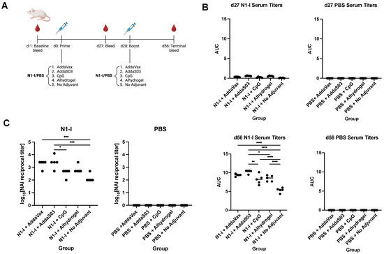 For the N1-I NA study, five six-to-eight-week-old female BALB/c mice (Charles River Laboratories, Wilmington, MA, USA) per group were immunized intramuscularly with 6 μg of N1-I COBRA HA or PBS adjuvanted with AddaVax, AddaS03, CpG ODN 2395, and Alhydrogel (Invivogen, San Diego, CA, USA), or with PBS as a no adjuvant control. Mice were bled at 27 days post-prime for d27 serum, then immunized at 28 days post-prime with 6 μg of the antigen. At 56 days post-prime, animals were bled for d56 serum, and then euthanized with Avertin.