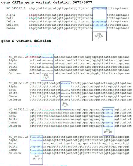 Portion of S gene sequence (of the SARS-CoV-2 genome): Wild type and variant showing the deletions 69–70 and portion of ORF1a gene with deletion 3675/3677.