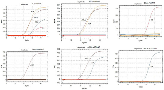 The working solution contained a mix of six primers and probes in a single tube, and the final concentration for each reaction is shown in Table 1. Taq DNA Polymerase and Reverse Transcriptase qPCRBIO Probe 1-Step Go No-ROX (cat. PB2543) were used according to the manufacturer’s instructions (PCR BIOSYSTEMS, PCR Biosystems Ltd., London, UK). Real-time PCR conditions were as follows: reverse transcription for 10 min at 45 °C, RT inactivation/Taq DNA polymerase activation for 2 min at 95 °C, followed by 40 cycles of 15 s at 95 °C and 30 s at 60 °C. Real-time PCR tests were run on an Amplilab real-time machine (Adaltis srl, Guidonia Montecelio, Italy). The results of our multiplex PCR assay are shown in Table 2. The specificity of our assay was evaluated by performing a PCR test in which the working solution was tested on a mix containing all the positive controls: Twist Synthetic SARS-CoV-2 RNA Controls 15, 16, 17, and 18 (Twist Bioscience) and an aliquot of a positive clinical sample known to be the Omicron variant. The sensitivity of our assay was explored by using a 10-fold serial dilution of each control from Twist Bioscience as well as an Omicron positive sample.