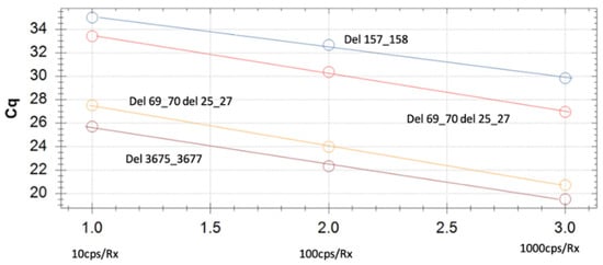 To confirm the nature of the variants identified by our assay, samples were analyzed by sequencing. An overall agreement of 98% was recorded between the sequencing and PCR results. In particular, 100 samples showed a sequence compatible with deletions 69–70 (Alpha variant), eight samples were confirmed as Beta and four as Delta. Two hundred samples, without deletions 69–70 and showing the FAM signal, were classified as positive for the Omicron variant. Mixed electropherograms with overlapping peaks were observed in ten samples. Finally, the remaining 78 samples did not show deletions or relevant mutations when compared with the wild-type strain. Figure 1 reports sequences of a variant with a 69/70 and 3675/3677 deletion, while Figure 2 shows a mixed electropherogram. The latter was likely due to the presence of two viral genomes simultaneously in the same samples. The possible presence of two different lineages was also reported by Benites et al. and by Richard L Tillett et al. [3,30]. Table 2 reports the interpretation of the results of our assay. It must be considered that the presence of the variant was ascertained by comparing the signals registered in the different channels (FAM, ROX, Cy5, Cy5.5) after the amplification assay. In fact, the Alpha, Beta, and Gamma variants have the deletion on ORF1a in common, while deletions 69–70 are only present in the Alpha variant, and deletion 25/27 is present in Omicron. Deletion 241/243 characterizes the Beta variant. Thus, if in our assay there were signals for two fluorophores (TX RED, CY5.5) (identifying deletion 241/243 as well as 3675–3677), it would mean that the Beta variant was present. Otherwise, in the presence of a unique signal for the fluorophore (Cy5) (157/158 deletion), we can conclude that the sample is positive for the Delta variant. A combination other than those described may indicate a new mutation or a coinfection of several variants. The sensitivity and specificity of our test are reported in Figure 3 and Figure 4, respectively. No cross-reaction has been recorded (Figure 3) while the sensitivity is equal to 10 reaction copies (Figure 4).
