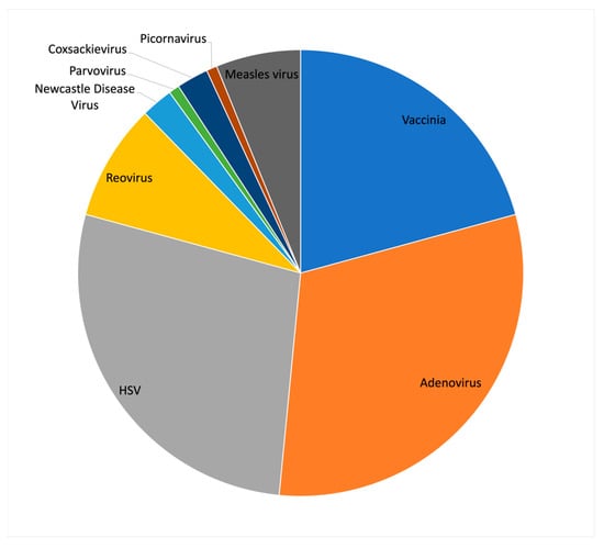 Summary of virus types currently in clinical trials as oncolytic agents. (Data source: clinicaltrials.gov, accessed on 1 October 2022).