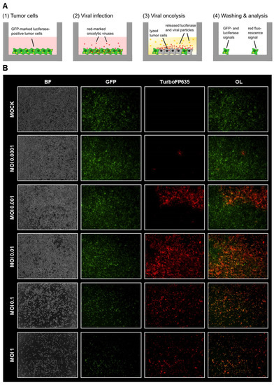 Virotherapeutic treatment of GFP/luc-labeled human HT-29 tumor cells in cell culture with GLV-0b347. (A) Schematic illustration of the three-step virotherapeutic process and associated detection capabilities: (1) GFP/luc-labeled HT-29 tumor cells were seeded into a 24-well cell culture plate. Successful plating of the cells can be verified by the determination of GFP fluorescence. (2) The treatment of HT-29 cells with oncolytic viruses encoding a red-fluorescent marker protein. The successful infection of the tumor cells can be verified by the determination of red fluorescence. (3)/(4) The viral oncolysis can be determined by a decrease in GFP as well as in luciferase activity. Over time, enhanced red fluorescence indicates an increasing number of tumor cells being infected by the red-fluorescence marker gene encoding virotherapeutic compounds. (B) The fluorescence images of HT-29 GFP/luc-labeled cells at 72 h postinfection (hpi) with GLV-0b347 at different multiplicities of infection (MOIs), as depicted. BF, brightfield; OL, overlay of GFP and TurboFP635 signal.