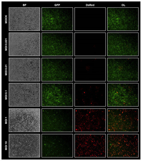 Fluorescence microscopy images taken at 72 hpi showed that GFP/luc–HT-29 cells could be successfully infected by both GLV-0b347 (Figure 1B) and MeV-DsRed (Figure 2) in an MOI-dependent manner. In tumor cells infected with GLV-0b347, an increasing fluorescent signal of the marker protein TurboFP635 was detected until a maximum was reached at an MOI of 0.01. At higher MOIs of 0.1 and 1, the fluorescent signals of TurboFP635 and GFP were significantly reduced, thereby indicating that oncolysis had already occurred substantially at this stage of infection after 72 h (Figure 1B).