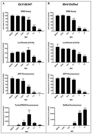 For this purpose, GFP/luc-labeled human HT-29 colorectal cancer cells were infected in vitro with increasing MOIs of vaccinia virus GLV-0b347 (Figure 3A) or measles vaccine virus MeV-DsRed (Figure 3B). At 72 hpi, virus-mediated oncolysis was analyzed using (i) the SRB assay, (ii) the measurement of luciferase activity, and (iii) the quantification of GFP and TurboFP635/DsRed fluorescence (Figure 3). As expected, the quantification of GFP and TurboFP635 fluorescence signal in GLV-0b347-infected cells mirrored the observations in the fluorescence microscopy images. The greatest infection was seen with an MOI of 0.01, as reflected by the maximum TurboFP635 signals at 72 hpi, while GFP fluorescence decreased markedly when tumor cells were infected with MOIs higher than 0.01. Furthermore, the results of the SRB assay confirmed the successful MOI-dependent GLV-0b347-induced oncolysis of HT-29 cells with nearly identical sensitivity. This assay also showed that the remaining tumor cell masses decreased markedly at 72 hpi with GLV-0b347 at an MOI of 0.01 and higher. When luciferase activity was examined, a slight increase was observed at an MOI of 0.01, which may be explained by an initial virus-mediated boost in general cell metabolism [14,15]. However, at higher virus concentrations (MOIs of 0.1 and 1), the expected pronounced reduction in luciferase activity occurred, which again could be attributed to the significant oncolysis of HT-29 cells (Figure 3A).