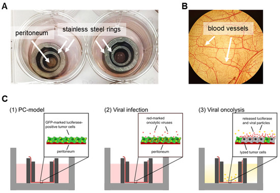 Human ex vivo peritoneum model and schematic illustration of the three-step virotherapeutic process in co-cultures with GFP/luc-labeled human HT-29 tumor cells. (A) Photographic image of the human ex vivo peritoneal model cultivated between stainless steel rings in a 24-well plate. (B) Photographic image of the peritoneum in the ex vivo model through a light microscope. (C) (1) Preparation of co-cultures of the peritoneum from noncancer patients and human GFP/luc-labeled HT-29 tumor cells. Successful plating of the cells can be verified by fluorescence microscopy. (2) Virotherapeutic treatment of co-cultures with oncolytic viruses carrying a red-fluorescent marker protein. Successful infection of the tumor cells can be verified by the determination of red fluorescence via fluorescence microscopy. (3) Viral oncolysis can be determined by a decrease in GFP and red fluorescence as well as by a decrease in luciferase activity.
