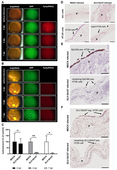 Infection of co-cultures with GLV-0b347 showed a significantly higher TurboFP635 signal (Figure 5A) compared to the MOCK-infected co-cultures (Figure 5B). This effect was observed in the infected sample as early as 2 dpi but subsequently decreased slightly over time. The GFP signal of tumor cells was stable in GLV-0b347-infected co-cultures but increased over time in MOCK-infected co-cultures. In addition, luciferase activity was clearly reduced in virus-infected co-cultures starting at 2 dpi, and further decreased strongly until 7 dpi compared to MOCK-treated samples, thereby indicating successful virus-induced oncolysis (Figure 5C). The IHC staining of co-cultures with GFP/luc-HT-29 revealed an effective tumor cell lysis and almost no remaining tumor cells in GLV-0b347-infected co-cultures compared to MOCK-treated co-cultures, as indicated by staining with hematoxylin and eosin (H&E) (Figure 5D) and EpCAM antibody (Figure 5E). Moreover, virus-specific stainings showed a selective infection of GFP/luc-HT-29 cells with GLV-0b347 without any signs of peritoneal infection (Figure 5F).