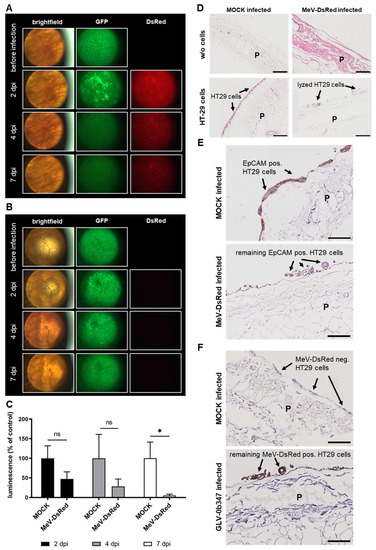 When comparing MeV-DsRed-infected (Figure 6A) with MOCK-treated co-cultures (Figure 6B) under the fluorescence microscope, a significantly higher DsRed signal was observed in the infected sample as early as 2 dpi, which remained at a constant level until the end of the experiment at 7 dpi. The GFP signal of tumor cells obtained before infection was clearly visible with comparable intensities in both samples but decreased over time in the MeV-DsRed-treated co-culture. In addition, luciferase activity was clearly reduced in virus-infected co-cultures starting at 2 dpi, and further decreased until 7 dpi compared to MOCK-treated samples, thereby also indicating successful virus-induced oncolysis (Figure 6C). In addition, IHC staining was performed, which showed efficient tumor cell lysis and reduced numbers of tumor cells in MeV-DsRed-infected compared to MOCK-treated co-cultures, as indicated by staining with H&E (Figure 6D) and EpCAM antibody (Figure 6E). Moreover, virus-specific stainings revealed a selective infection of GFP/luc HT-29 tumor cells with MeV-DsRed without infection of normal cells constituting the nontumorous peritoneal tissue (Figure 6F). This tumor cell-restricted infection was also confirmed when infections were performed in ex vivo peritoneum models without the co-culture of HT-29 tumor cells (Supplementary Materials Figure S2). In ex vivo models without co-culture, neither infection with GLV-0b347 (Supplementary Materials Figure S2A) nor with MeV-DsRed (Supplementary Materials Figure S2B) resulted in the fluorescence microscopic detection of TurboFP635 or DsRed on the peritoneal tissue at 7 dpi. In contrast, both a distinct TurboFP635 (Supplementary Materials Figure S2A) and a pronounced DsRed fluorescence signal (Supplementary Materials Figure S2B) were observed at the same time point in peritoneum models with HT-29 tumor cells.