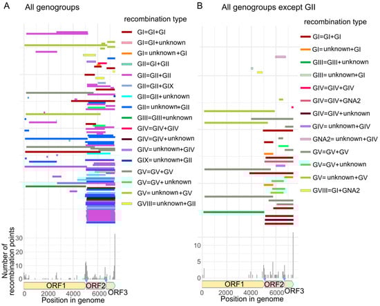 3.2. Recombination Breakpoints throughout the Genome and among Genogroups
