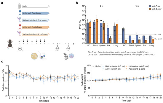 Following intraperitoneal injection, phages disseminate via blood without inducing adverse effects. (a) Scheme indicating experimental procedures of the study. Created with Biorender.com. Naive mice (C57BL/6J WT, female, 8–10 weeks; Janvier Labs) were treated (i. p., 100 μL) with active or UV-inactivated phage cocktails against P. aeruginosa or E. coli or buffer at 24 h intervals for 7 days. Analysis time points were 6 h, 10 d or 21 d post-injection. (b) Logarithmic display of phage load at 6 h and 10 d in indicated organs (peritoneal cavity (PC), blood, spleen, alveolar spaces (BAL), and lungs). DL-P. aeruginosa, detection limit of anti-P. aeruginosa phages against PA74 (83 PFU/mL); DL-E. coli, detection limit of anti-E. coli phages against AN33 (10 PFU/mL). Results are shown as mean ± SD; n = 9 mice per group. (c) Graphs displaying body temperature and body weight change over time (dpi, days post-injection). Results are shown as mean ± SEM; n = 9 mice per group (6 h, 10 d) or n = 5–6 (21 d). PMNs, polymorphonuclear neutrophils.