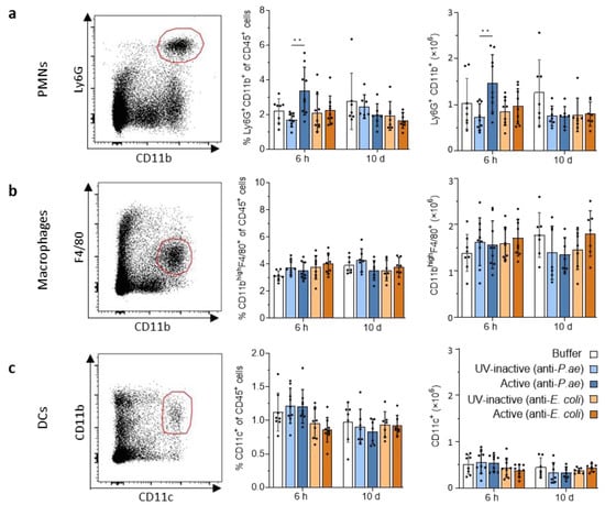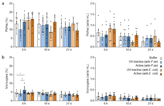 Generally, the parameters, including blood leukocytes and subtypes, platelets, hematocrit (HCT) and hemoglobin (HGB), were inconspicuous and did not differ between treatment groups and controls (Figure S3). Specifically, the mobilization of polymorphonuclear neutrophils (PMNs) into blood from bone marrow, which has been shown to occur within 6 h after exposure to a substance recognized as foreign [49], was not detected upon anti-P. aeruginosa and anti-E. coli phage cocktail treatments at this time point (Figure 2a). However, we did observe a significant increase in the fraction of monocytes at 6 h after the first anti-P. aeruginosa phage cocktail treatment, the biological impact of this 3% increase is likely to be minor, particularly since the number of monocytes per mL blood did not change (Figure 2b). At the later time points of 10 d and 21 d after the start of treatment, no changes in innate immune cell numbers and proportions in blood were detected (Figure 2a,b).