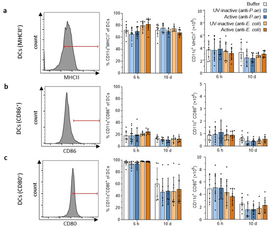 As DCs are the most competent APCs [50,51], we tested whether they upregulate MHCII on their surface as a marker of activation-induced enhanced antigen processing and presentation [52,53]. The proportion of MHCII-expressing DCs in the spleen did not increase at any of the time points analyzed, but remained in the same range as observed for the buffer and UV-inactivated phage cocktail controls (50–90%). Surface mean fluorescence intensity (MFI) of MHCII on DCs also failed to increase. MFI can be used as an equivalent to the number of MHCII molecules present on their surface, as the MFI directly correlates with the amount of stained antigen (Figure 4a). In line with this, the proportions of DCs expressing the costimulatory molecules CD80 or CD86 on their surface did not increase, nor did the MFI of CD80 or CD86 (Figure 4b,c).