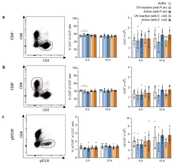 Repetitive phage therapy carries a risk of inducing memory cells, which could be detrimental for any potential subsequent phage treatment. As a prerequisite for T-cell memory, we investigated whether repeated phage treatments induced T-cell responses in the spleen and draining lymph nodes. In lymph nodes, CD4, CD8 and γδ T cell frequencies remained similar in all groups at 6 h and 10 d and represented around 60% (a, CD4+), 40% (b, CD8+) and 1.3% (c, γδTCR+) of all T cells (CD3+) (Figure 5a–c). At 6 h post-treatment with the anti-P. aeruginosa phage cocktail, the proportions of CD4 T cells were moderately yet significantly increased at the expense of CD8 T cells (Figure 5a,b). We did not observe any signs of phage-induced T-cell proliferation. Repetitive treatment with phage cocktails against P. aeruginosa or E. coli did not result in an increase in CD4, CD8 or γδ T cell numbers in the draining lymph nodes at 6 h and 10 d after treatment start compared to the buffer or UV-inactivated phage cocktail controls.