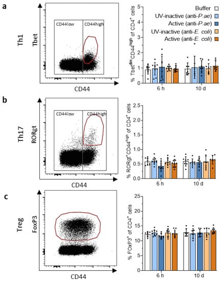 Despite the lack of changes in CD4, CD8 and γδ T cell numbers, we probed if CD4 effector subtypes were induced in the spleen and draining lymph nodes at 6 h and 10 d. T-helper cells type 1 (Th1) were identified by the surface expression of CD4 (CD4+), high expression levels of the activation marker CD44 (CD44hi) and intranuclear staining for the Th1-transcription factor T-bet. Only 1% of all CD4 T cells were of Th1 type and no increase in frequencies was observed in response to phage treatment at either time point (Figure 6a). Th17 cells were identified by CD4+, CD44hi and intranuclear expression of the Th17-transcription factor RORγt. The proportion of Th17 cells among CD4 T cells was around 0.5%. As for Th1 cells, we did not observe changes in response to phage treatment at either time point (Figure 6b). Regulatory T cells (Tregs) are characterized by CD4 and transcription factor FoxP3 expression. We did not discriminate between natural and peripheral Tregs [54]. Their frequencies were around 12% of CD4 T cells and remained unaffected by phage cocktail treatments at 6 h and 10 d (Figure 6c). As observed for CD4, CD8 and γδ T cells, the findings were similar in the spleen (Figure S5).