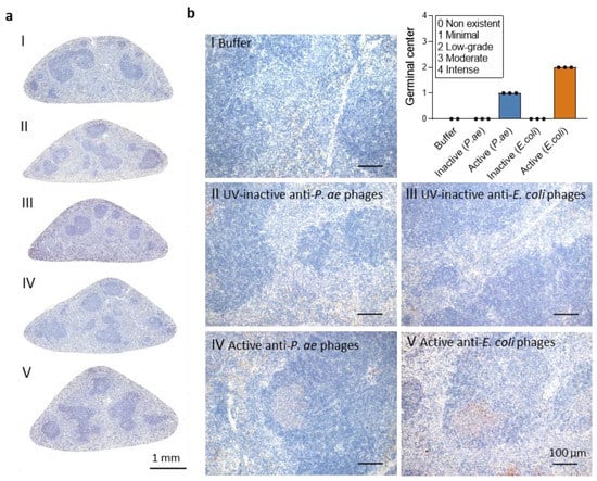 Phage treatment induces minimal to low-grade germinal center formation. Immunohistochemical staining of germinal center B cells (αGL-7 antibody; red) and hematoxylin (blue). Representative spleen sections (a) and corresponding enlarged images ((b), 20×) from animals at 21 d after start of treatment with (I) buffer, (II) UV-inactive anti-P. aeruginosa phage cocktail, (III) UV-inactive anti-E. coli phage cocktail, (IV) active anti-P. aeruginosa phage cocktail and (V) active anti-E. coli phage cocktail. Bar graph showing germinal center formation scores; n = 2–3 mice per group.