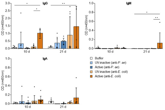 In congruence with the presence of germinal centers, the active anti-E. coli phage cocktail induced an increase in IgG, IgM as well as IgA by 21 days compared to the buffer or UV-inactivated control, which for IgG was already evident by 10 d. In contrast, the treatment with the active anti-P. aeruginosa phage cocktail only induced a marked increase in IgG and only at the 21 d time point, but this did not reach significance. A small increase in IgG was also induced by the UV-inactivated phage cocktails but may be reflective of individual outliers. These findings suggest that the repetitive injection of each of the two phage cocktails initiated a minimal humoral B-cell response with secretion of phage-specific antibodies.