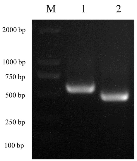 The peripheral blood of mixed-breed dogs was collected, total RNA in the peripheral blood white blood cells was extracted using the TRIzol method, and the canine tetherin gene was amplified using PCR after RT into cDNA. Electrophoresis was carried out on 1% agarose gels at 130 V for 30 min. Based on the sequence of canine tetherin in the NCBI database (GenBank accession no. XM_038428239), the coding region of canine tetherin contains 576 nucleotides and encodes 188 amino acids. The canine tetherin gene (tetherin-X1) amplified from canine peripheral blood cells was consistent with the information in the NCBI database. In addition, a truncated canine tetherin gene (tetherin-X2) was amplified (Figure 1).