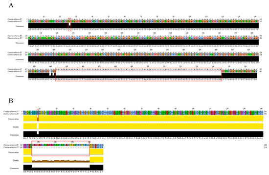 Bioinformatics analysis of the two canine tetherin isoforms (A,B). Comparison between the nucleotide and amino acid sequences of canine tetherin-X2 and canine tetherin-X1. The nucleotide and amino acid sequences were visualized using Jalview software (https://www.jalview.org (accessed on 2 December 2022)). Red frame indicate lost sequences from Tetherin-X2 alignment to Tetherin-X1.