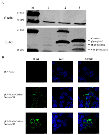 The eukaryotic expression plasmids pEF-FLAG-Canine-Tetherin-X1 and pEF-FLAG-Canine-Tetherin-X2 were transiently transfected into 293T cells. Western blotting and IFA were used to determine the expression and subcellular localization of tetherin-X1 and tetherin-X2. The Western blot results showed that the size of full-length tetherin-X1 was between 15 and 35 kDa and that of truncated tetherin-X2 was between 15 and 31 kDa; in addition, and the Western blot results showed that 3 bands were caused by the migration of tetherin in SDS–PAGE due to its glycosylation pattern (Figure 4A). The subcellular localization of canine tetherin was visualized with laser confocal microscopy. Tetherin-X1 was distributed on the cell membrane, as was truncated tetherin-X2 (Figure 4B).