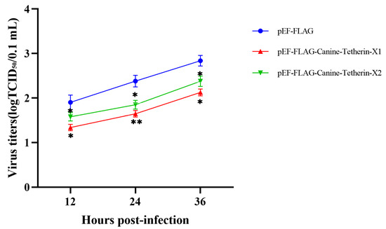 HEK 293T cells were transfected with pEF-FLAG, pEF-FLAG-Canine-Tetherin-X1, and pEF-FLAG-Canine-Tetherin-X2 separately in 12-well plates. HEK 293T cells were infected with the H3N2 CIV strain A/canine/Guangdong/02/2014 (GD/2014) 24 h after transfection. After incubation with the virus for 1 h at 37 °C in an incubator with 5% CO2, the virus solution was discarded, the cells were washed with PBS, and DMEM containing 0.5 µg/mL of TPCK-trypsin, 1% FBS, and 1% penicillin and streptomycin was added. The culture was continued in an incubator with 5% CO2 at 37 °C. The virus was collected as described above, and 200 µL of the supernatant was collected at 12 h intervals.