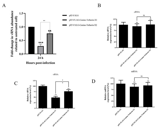 HEK 293T cells were transfected with pEF-FLAG, pEF-FLAG-Canine-Tetherin-X1, and pEF-FLAG-Canine-Tetherin-X2 separately in 12-well plates. 293T cells, 24 hours after transfection, were infected with the H3N2 CIV strain A/canine/Guangdong/02/2014 (GD/2014) and incubated at 37 °C for 1 h, and the culture medium was then replaced with 1 mL of DMEM containing 0.5 µg/mL of TPCK-trypsin, 1% FBS, and 1% penicillin and streptomycin. The viral supernatant was collected 24 h post-infection, and viral RNA (vRNA) was extracted using the TRIzol method. cDNA was synthesized using a HiScript III 1st Strand cDNA Synthesis Kit (+gDNA wiper) (Vazyme, Nanjing, China), and the reverse transcription primer was designed (IAV-vRNA: 5′-AGTCTTCTAACCGAGGTCGAAACGTA-3′). vRNA was analyzed with RT–qPCR using a ChamQ SYBR qPCR Master Mix (Vazyme, Nanjing, China). Primers (qPCR-CIV-F: 5′-TCAAGTGATCCTCTCGTTATTGC-3′, qPCR-CIV-R: 5′- CACTCTGCTGTTCCTGCCGATA-3′, GAPDH-human-F: 5′- AGATCCCTCCAAAATCAAGTGG-3′, and GAPDH-human-R: 5′-GGCAGAGATGATGACCCTTTT-3′) were synthesized. Similarly, HEK 293T cells were transfected with pEF-FLAG, pEF-FLAG-Canine-Tetherin-X1, and pEF-FLAG-Canine-Tetherin-X2, separately, in 12-well plates. The cells were infected with H3N2 CIV (GD/2014) 24 h after transfection, and total RNA in the cells was extracted 24 h post-infection. Reverse transcription primers (IAV-cRNA: 5′-AACATCCACAGCACTCTGCTGTTCCT-3′, IAV-vRNA, Oligo (dT)) were synthesized for the amplifications of CIV-complementary RNA (cRNA), vRNA, and mRNA. The levels of CIV cRNA, vRNA, and mRNA in infected cells were measured with RT–qPCR using a ChamQ SYBR qPCR Master Mix (Vazyme, Nanjing, China). Differences in expression were calculated using the 2−∆∆CT method.