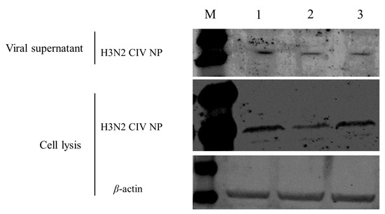 HEK 293T cells were transfected with pEF-FLAG, pEF-FLAG-Canine-Tetherin-X1, and pEF-FLAG-Canine-Tetherin-X2 and were infected with H3N2 CIV (GD/2014) 24 h after transfection. Proteins were extracted from the viral supernatant and cells 24 h post-infection and analyzed via Western blotting (Figure 7). In the viral supernatant, the band corresponding to H3N2 CIV NP in the empty vector-transfected group was significantly more intense than those in the groups transfected with Tetherin-X1 and Tetherin-X2. In cell lysates, the bands corresponding to H3N2 CIV NP in the groups transfected with tetherin-X1 and tetherin-X2 were less intense than that in the empty vector-transfected group. Moreover, the band corresponding to NP in the tetherin-X1-transfected group was less intense than that in the tetherin-X2-transfected group.