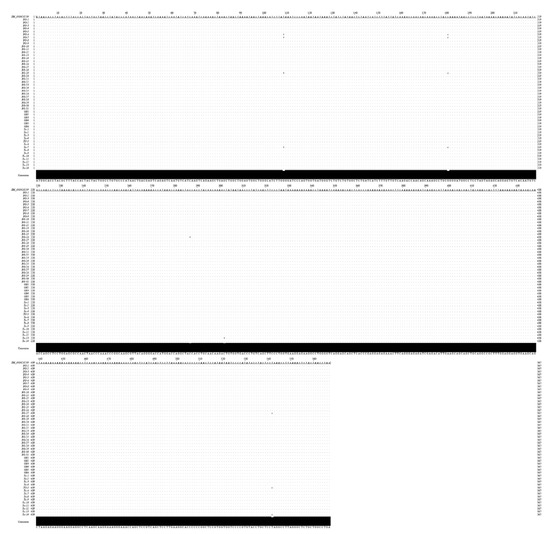 Alignment of the nucleotide sequences of amplified tetherin. Fifty-one canine tetherin genes were amplified from the peripheral blood of different dogs. The canine tetherin sequence (XM_038428239) was downloaded from GenBank. BG indicates that the tetherin gene that was amplified was from a beagle. Tu indicates that the tetherin gene that was amplified was from a mixed-breed dog. GB indicates that the tetherin gene that was amplified was from a poodle. The nucleotide sequences of tetherin were visualized using Jalview software (https://www.jalview.org (accessed on 30 November 2022)).