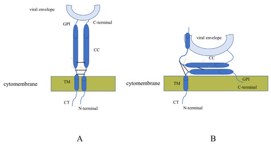Tetherin (also named BST2, CD317, and HM1.24), an innate immune factor induced by interferon, also has potential antiviral activity [5,6]. According to previous research, tetherin was discovered to inhibit the release of human immunodeficiency virus type 1 (HIV-1) [7,8]. Tetherin has been shown to restrict the release of various enveloped viruses, such as retroviruses, filoviruses (Ebola and Marburg viruses), arenaviruses (Lassa virus), paramyxoviruses (Nipah and Hendra viruses), and gamma herpesvirus (Kaposi’s sarcoma-associated herpesvirus, KSHV) [9,10,11,12,13,14]. Tetherin contains an N-terminal cytoplasmic tail (CT), a transmembrane domain (TM), a coiled-coiled ectodomain, two potential N-linked glycosylation sites, three extracellular cysteine residues, and a C-terminal glycosylphosphatidylinositol (GPI) anchor [11,12,14,15]. Tetherin is a homodimer with lipid-raft-associated intact type II membrane glycoproteins [16]. The unique membrane topology of tetherin is key to its antiviral activity [17]. The tetherin protein has membrane anchors at its N- and C-termini, which enable its simultaneous insertion into the viral envelope and the plasma membrane [18]. A physical connection is thus formed between the virus and the host cell by tetherin, and this connection impedes the release of progeny virions into the extracellular space [19]. Studies have shown that the TM- and GPI-modified C-terminus of human tetherin drive the insertion of tetherin into the lipid envelope of HIV-I to restrict viral release. The ectodomain is also glycosylated by two N-linked carbohydrate chains that are heterogeneously modified (possibly by polylactosaminoglycan) that cause tetherin to migrate in SDS–PAGE as a smear of 28–45 kDa [15].
