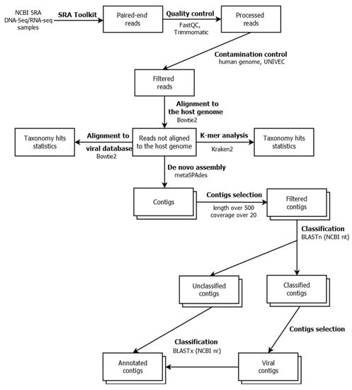 The software pipeline used in this work, with the analysis steps and their connections indicated and the programs used specified. https://github.com/starchevskayamaria17/uncoVir, accessed on December 2022.